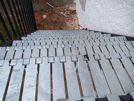 Der Treppen- und Bodenbelag wurde aus Flachstahl mit spezieller Verzahnung hergestellt.