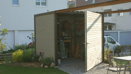 Pergola aus Stahl, mit Abstellraum für Rasenmäher, Tische und Stühle. Mit zwei Varianten der Verkleidung: einmal aus Holzverschalung und einmal aus Stahlblech, roh