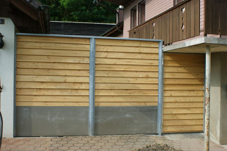 Die bestehende Hecke nahm zu viel Platz ein. Wir konnten für die Bauherren eine Sichtschutzwand konstruieren und montieren. Diese besteht aus Pfosten mit U-Profil und Führungen für das Einschieben der Holzfüllung. Obendrauf wurde als Abdeckung ein Blech montiert.