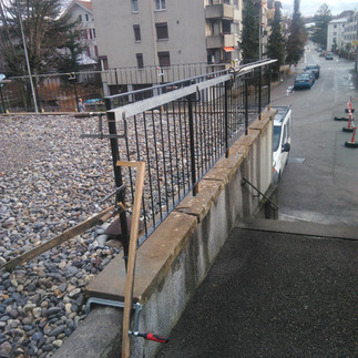 Auf der Mauer wurden Kernbohrungen angebracht, in welchen das Staketengeländer einbetoniert werden konnte. So konnte man die Befestigung mit einer Fussplatte umgehen, da die Befestigung der Steinplatte auf der Mauer nicht genau überprüft werden konnte.