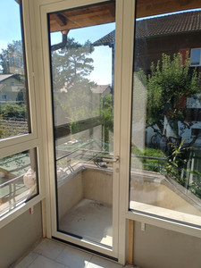 Bei einer bestehenden Terrasse haben wir die alte Wetterschutzverglasung demontiert und durch eine Isolierte Konstruktion ersetzt. Dabei wurden die Türgrösse und die zwei Schwingfenster auf der Seite übernommen.